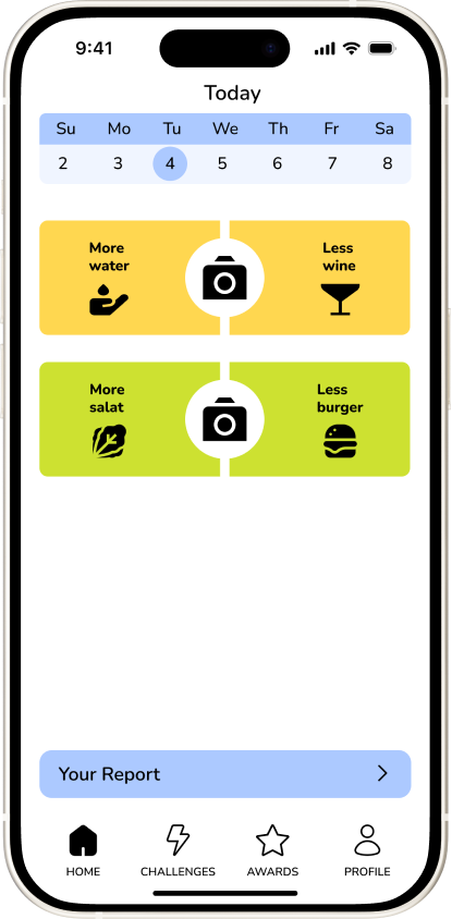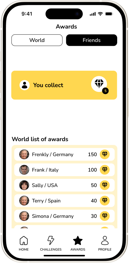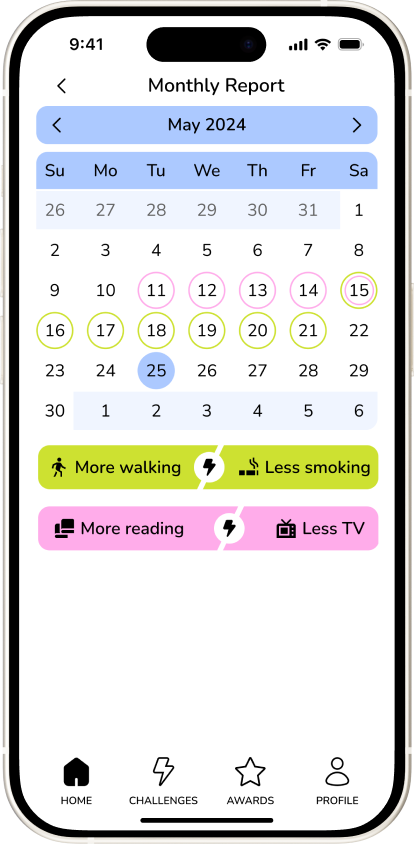 In the monthly report, users can find the results of past challenges. Since the application is gamified, users receive a certain number of rewards for each successful challenge. They can compare your scores with other users and friends. The application has a profile page where peoplle can change settings and add information at any time.