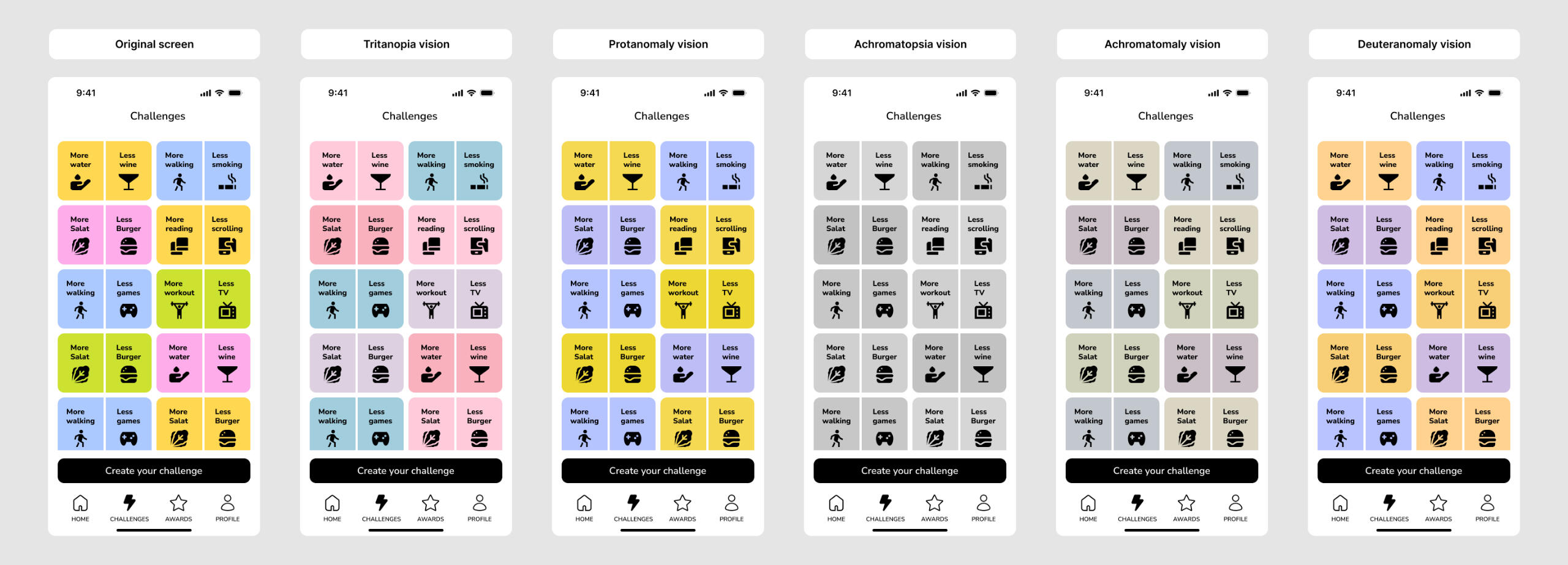 There are an estimated 300 million people in the world with color vision deficiency. These screens show that people with color blindness could distinguish the main functions of the application just as clearly.