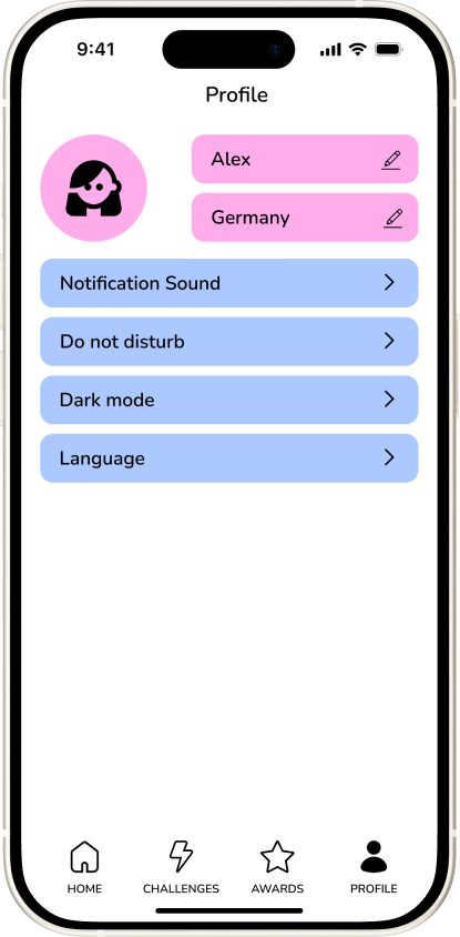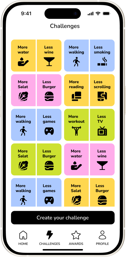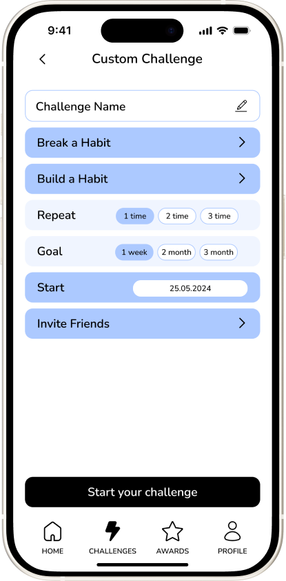 When users enter the app for the first time, they are taken directly to the challenge screen. The user can choose a challenge from the list or create his own.