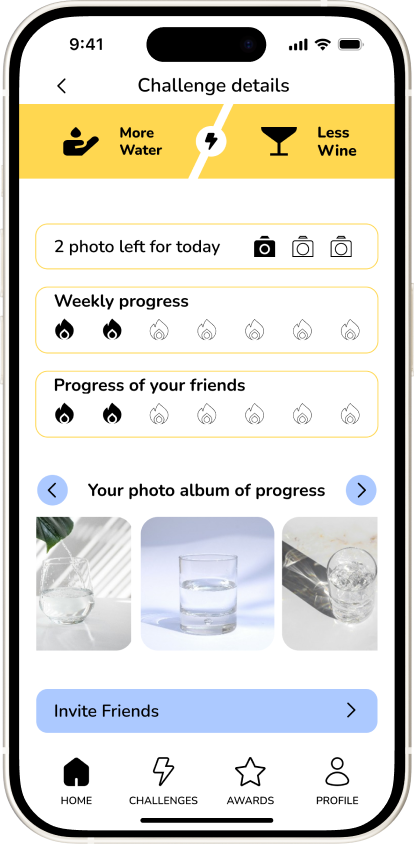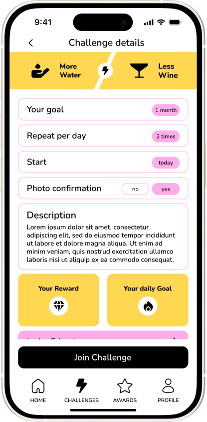For example, I want to give up wine and drink more water instead. In the challenge details, the user can read what he or she will receive for completing the challenge and invite friends to join.