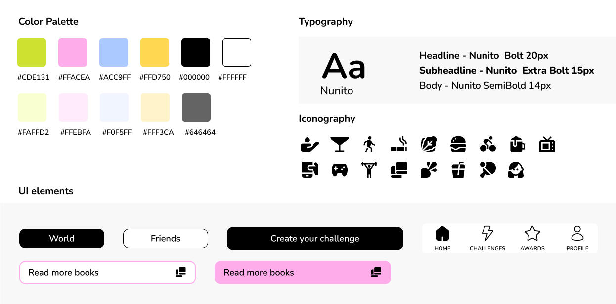 When designing the UI for the Habit Master App, I knew the colors needed to reflect its vibrant and dynamic nature, echoing the app's gamification elements. However, balancing this energy with the app's functional purpose was crucial. Too many colors or overly bright shades could detract from its usability.I chose black as the main accent color, providing a sleek and modern touch while ensuring important elements stand out. White serves as the background color, creating a clean and uncluttered canvas that enhances readability and focus. The remaining colors are used thoughtfully as shading or complementary accents, adding bursts of energy and guiding the user's attention without overwhelming the interface. This careful selection and balance of colors ensure that Habit Master is both engaging and user-friendly, striking the perfect harmony between excitement and functionality.