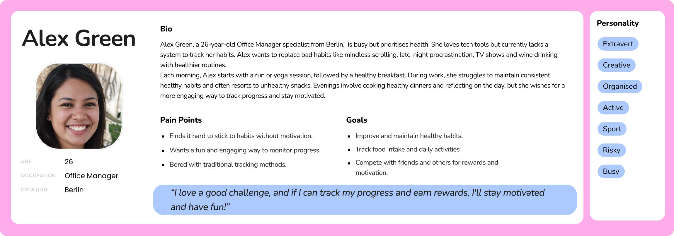 Meet Alex Green, a dynamic 26-year-old Office Manager from Berlin who juggles a busy work schedule while striving to maintain a healthy lifestyle. Passionate about leveraging technology to enhance her well-being, Alex finds herself struggling with consistency when it comes to her habits. She often falls into the trap of mindless scrolling, late-night procrastination, binge-watching TV shows, and indulging in wine more than she'd like.Each morning, Alex kickstarts her day with a refreshing run or a calming yoga session, followed by a nutritious breakfast. However, during the hectic workday, her resolve wavers, and she frequently reaches for unhealthy snacks. Evenings are dedicated to preparing wholesome dinners and reflecting on her day, yet she feels a persistent need for a more stimulating way to track her progress and maintain motivation.Alex's main challenges include staying motivated to stick to her habits, finding an engaging method to monitor her progress, and overcoming the boredom associated with traditional tracking techniques.
